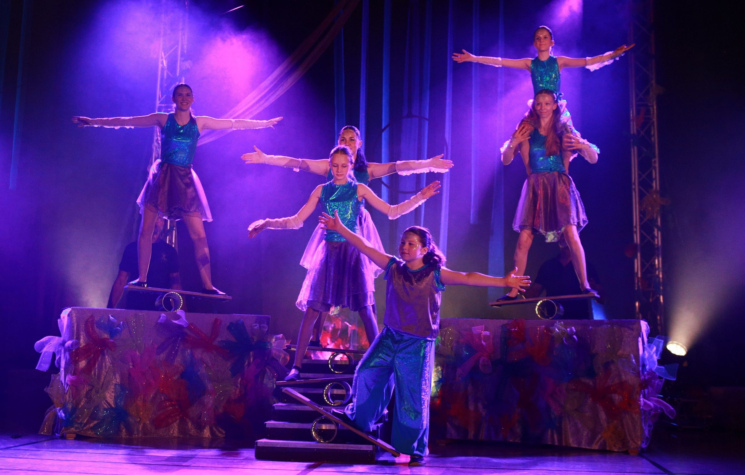 Wir sind die Akrobatik Gruppe, eine gemischte Gruppe aus Mädchen und Jungs. Neben Menschen-Pyramiden, Handständen, Räder schlagen, brauchen wir Ausdauer und Beweglichkeit, um uns am Boden elegant zu bewegen. Nicht nur statische Figuren, sondern auch Elemente aus dem Bodenturnen finden sich in unseren Auftritten.