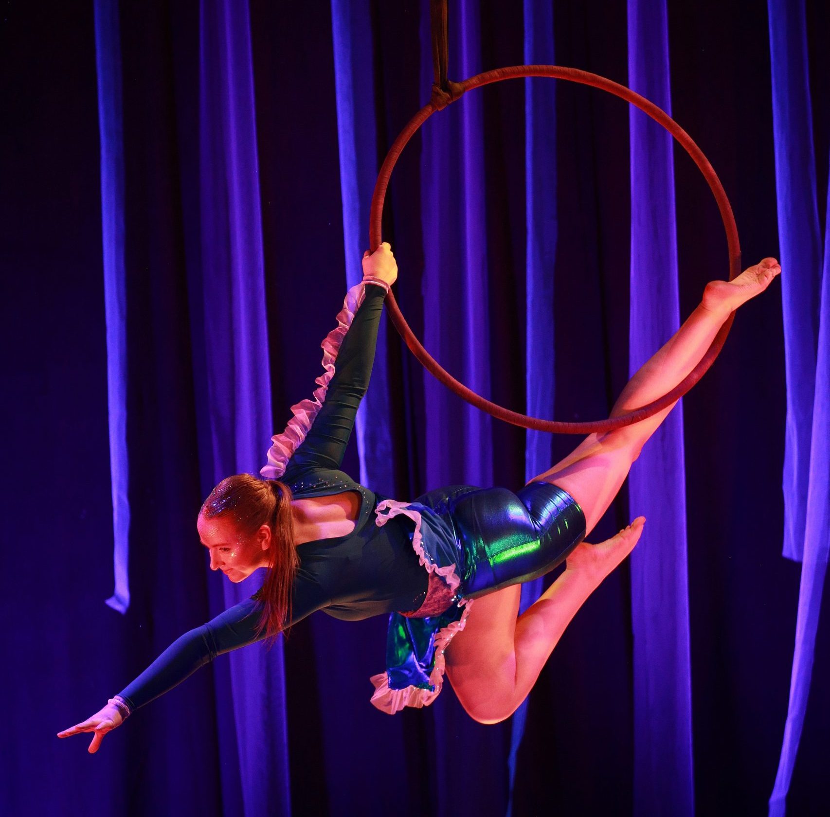 Wir sind die Ring Gruppe und bei uns ist Körperspannung und Kraft gefragt, denn loslassen ist keine Option. Egal ob alleine oder zu zweit im Ring auch in der Luft in ca. drei Metern Höhe müssen wir wie alle Disziplinen der Luftakrobatik schwindelfrei sein, wenn der Ring sich dreht. Nebenbei studieren wir gerne mitreißende Choreografien auf dem Boden und im Ring ein.
