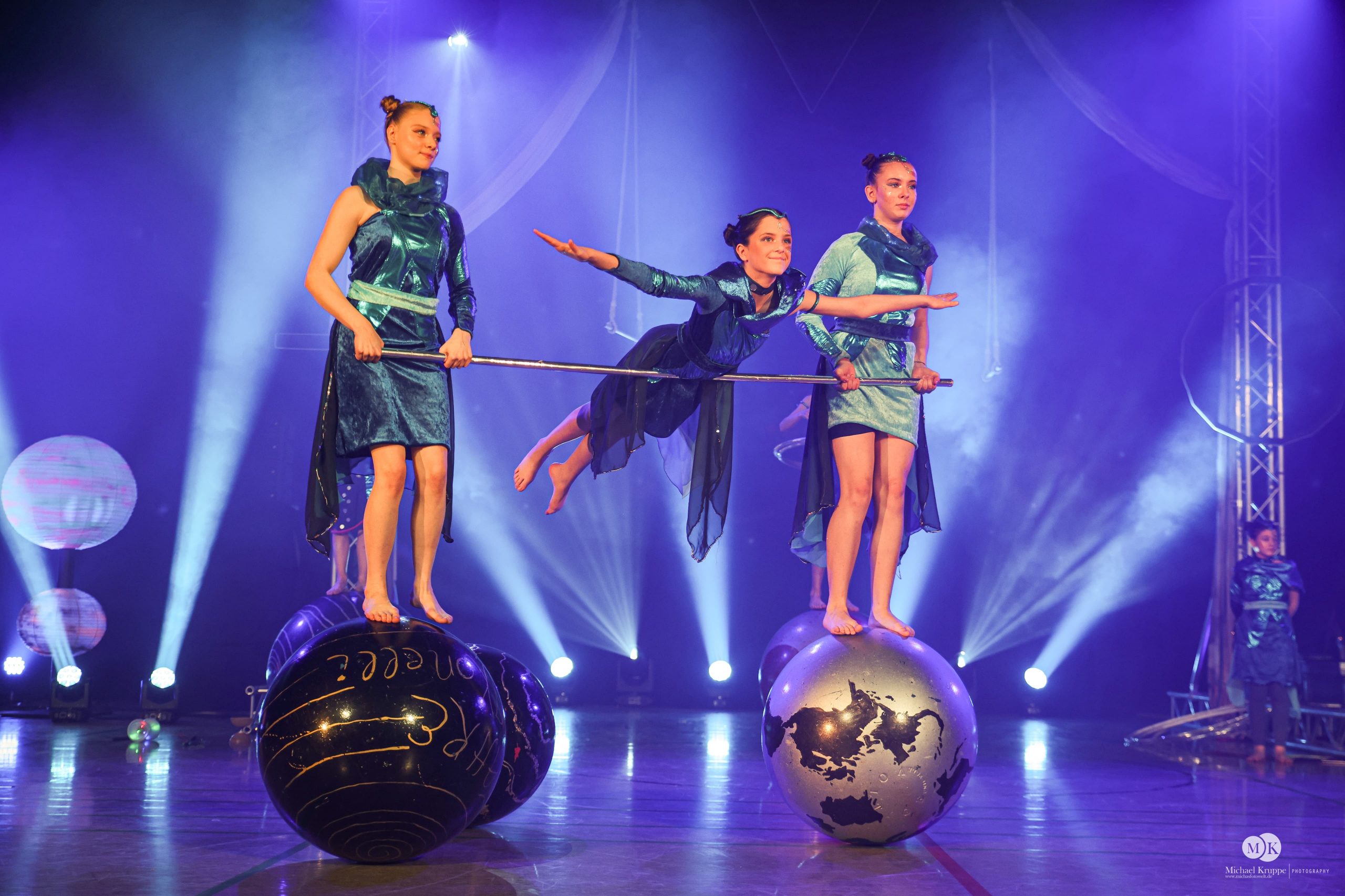 Wir sind die Laufkugel Gruppe und machen das, was andere auf dem Boden machen auf unseren Laufkugeln. Seilspringen und Hebefiguren sind uns nichts Neues, mit Requisiten wie den Hula-Hoop-Reifen springen wir flink und mit Balance von Kugel zu Kugel.
